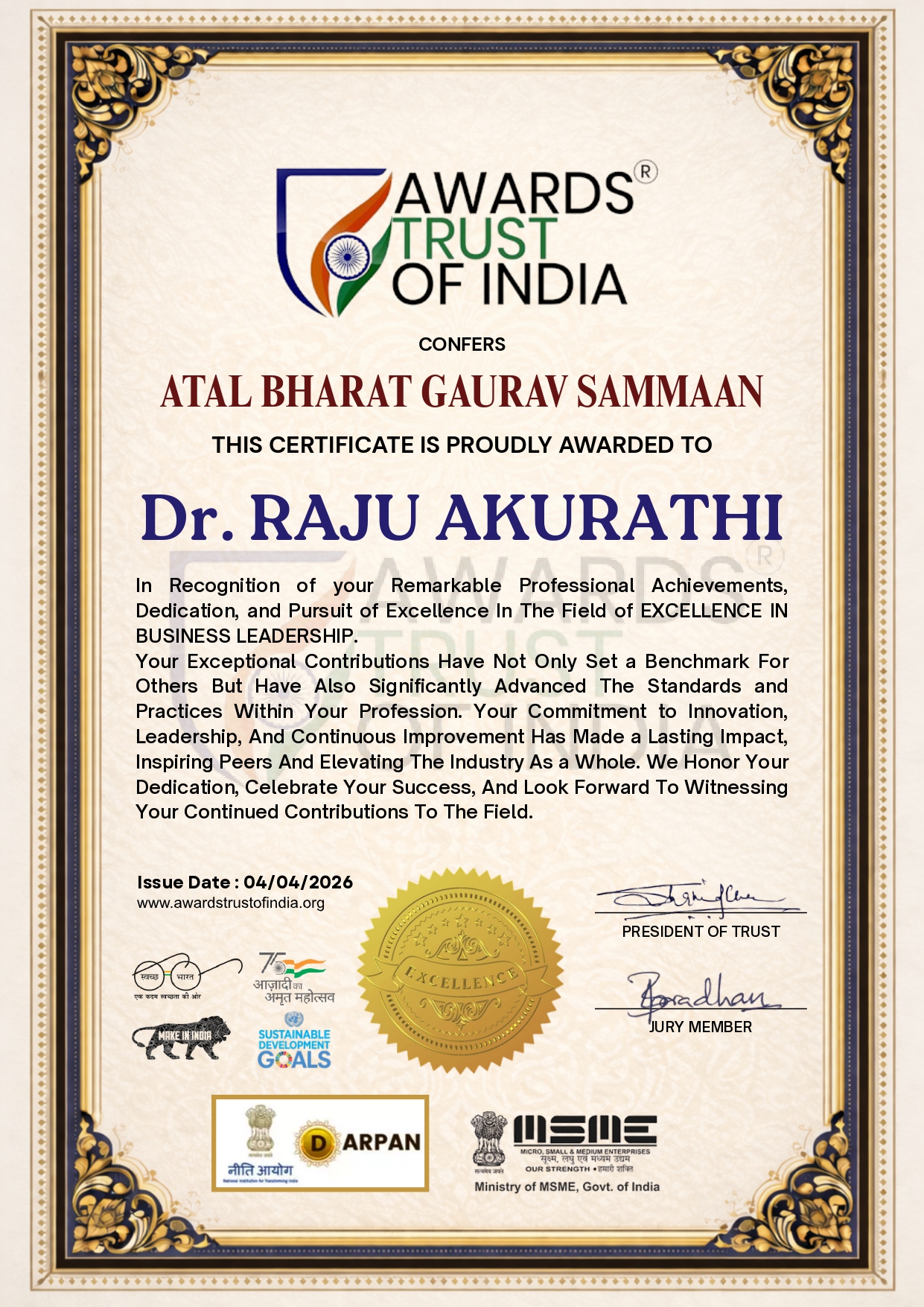Dr. Akurathi has consistently demonstrated excellence in both entrepreneurship and social service, earning recognition across multiple domains for his dedication to building opportunities and empowering communities.