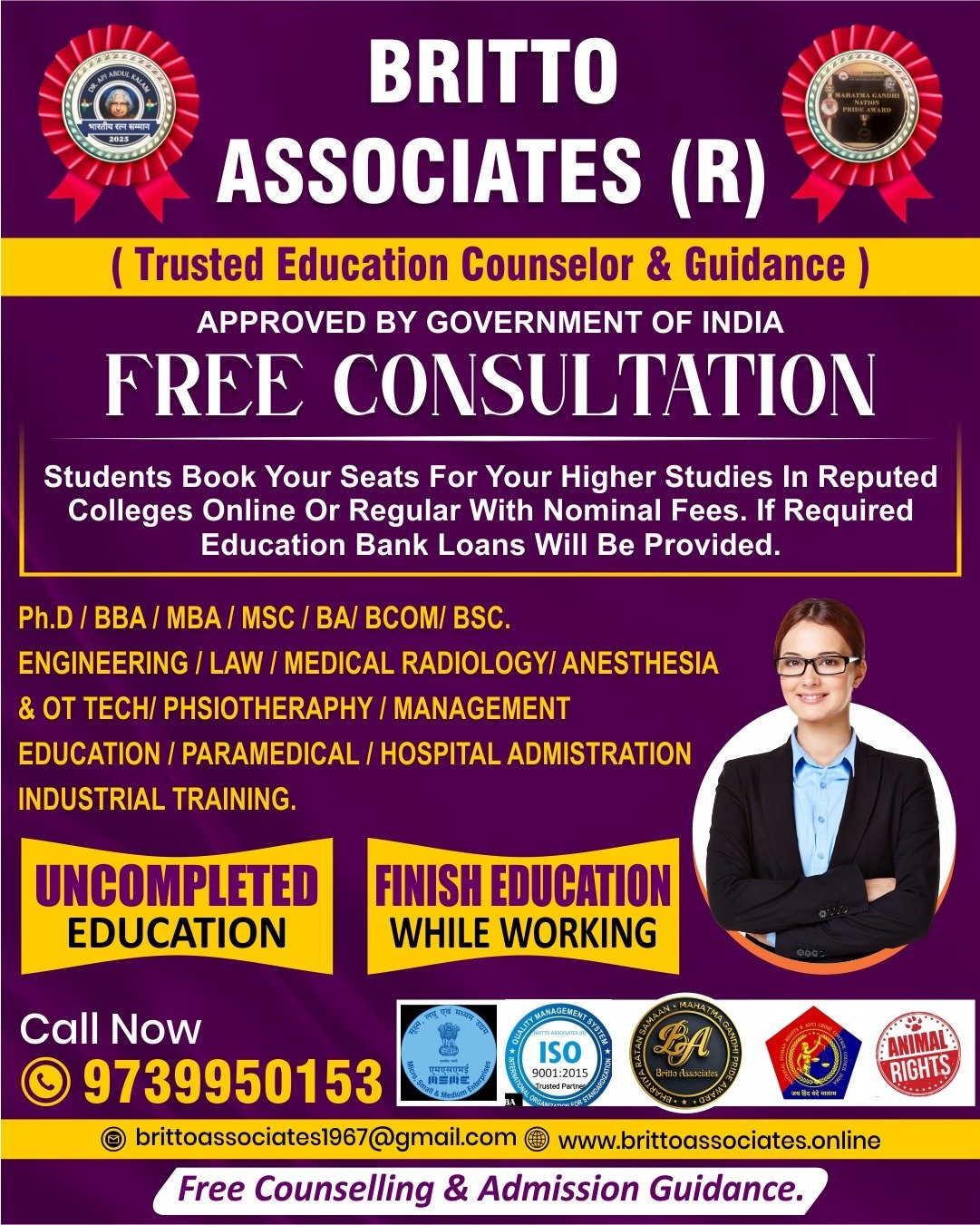 BRITTO ASSOCIATES (R) is a highly trusted education consultant in Bangalore, offering end-to-end admission guidance, education loan support, legal assistance, and IT job assistance. With ISO 9001:2015 International certification and MSME approval by the Government of India, Britto Associates continues to expand its network across Bangalore, Karnataka, and all over India.