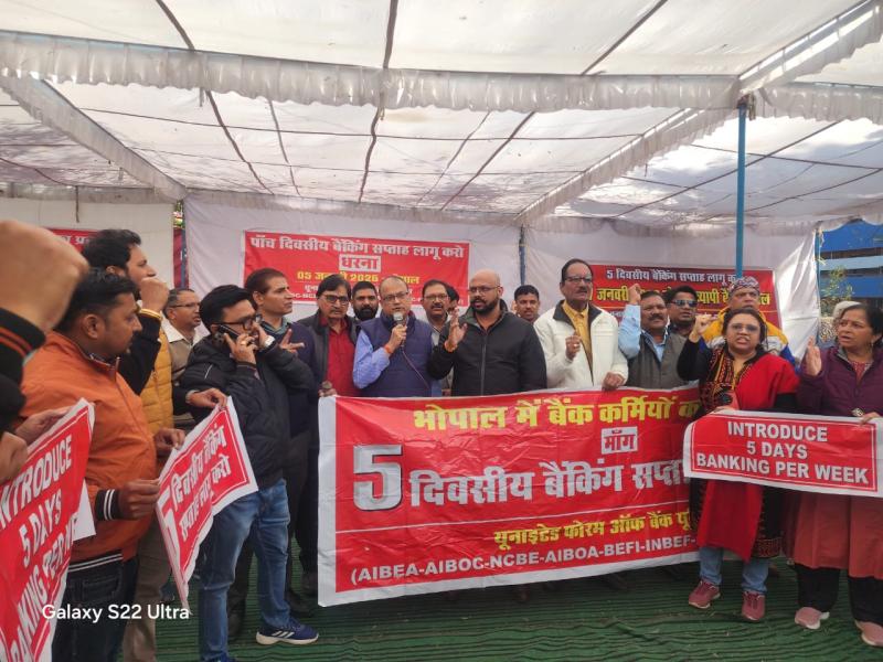 Bhopal. On the call of UFBU, bank officers and employees in the capital Bhopal held a strong, disciplined and united demonstration demanding implementation of a five-day banking week. Officials of organizations associated with various public sector banks and a large number of officers and employees were present in this demonstration organized at the venue PNB Press Complex. On this occasion, State Bank of India Officers Association, Bhopal Circle President Anil Kumar Srivastava, General Secretary Sanjeev Mishra and Circle Deputy General Secretary Rajneesh Puranic, Circle Media Incharge Arvind Pandiyar were present with dignity. Along with this, Subin Sinha, President of All India Bank Officers Confederation, Madhya Pradesh and senior officials of UFBU and All India Bank Officers Confederation, V.K. Sharma, Nazir Qureshi, Nirbhay Singh, Sanjay Kudeshia, Sunil Singh, Deepak Ratan Sharma and Deepak Nair were present on the stage. A large number of senior officers and employees of various banks including All India Bank Employees Association officials Praveen Meghani, Pankaj Thakur, Vasu Jethani, Siddharth Singh participated in the demonstration.